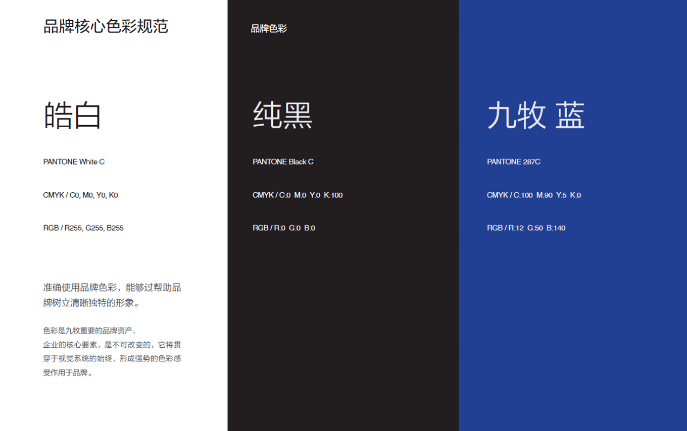 色彩是九牧重要的品牌資產企業的核心要素,是不可改變的,它將貫穿于視覺系統的始終,形成強勢的色彩感受作用于品牌。