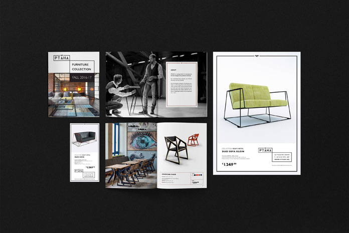 Ptaha furniture company develops graphic design and corporate image, furniture company Ptaha develops suitable corporate image. The brand name is derived from the Ukrainian word "птах", which means "bird". Their multinational team has offices in Munich, Germany and Kiev, Ukraine, producing modern furniture for homes and offices. Roman Vynogradnyi proposed the concept of corporate image, which was inspired by Scandinavian minimalism and natural aesthetics. The logo includes a stylized bird (PTAHA) symbolizing the brand name. Roman Vynogradnyi chose a color scheme that combines natural elements such as metal, bronze, wood and stone.